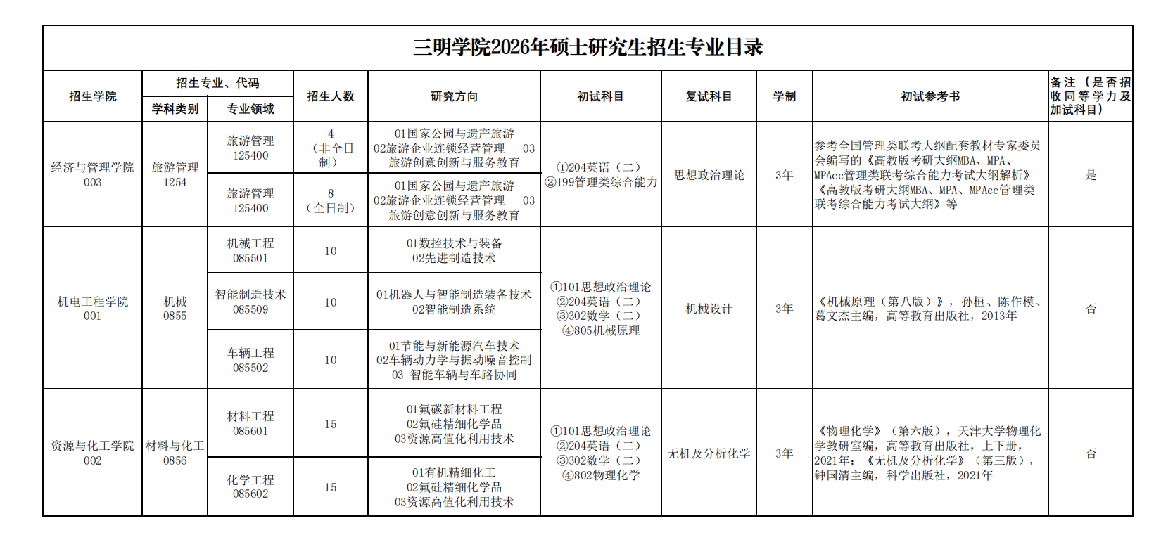 2026年我校招收机械、材料与化工、旅游管理3个专业硕士学位类别研究生。招生专业详见《三明学院2026年硕士研究生招生专业目录》,招生目录中的拟招生人数为计划招生数,各专业实际招生数将在国家下达招生计划后,综合各专业生源、学科实际情况确定。